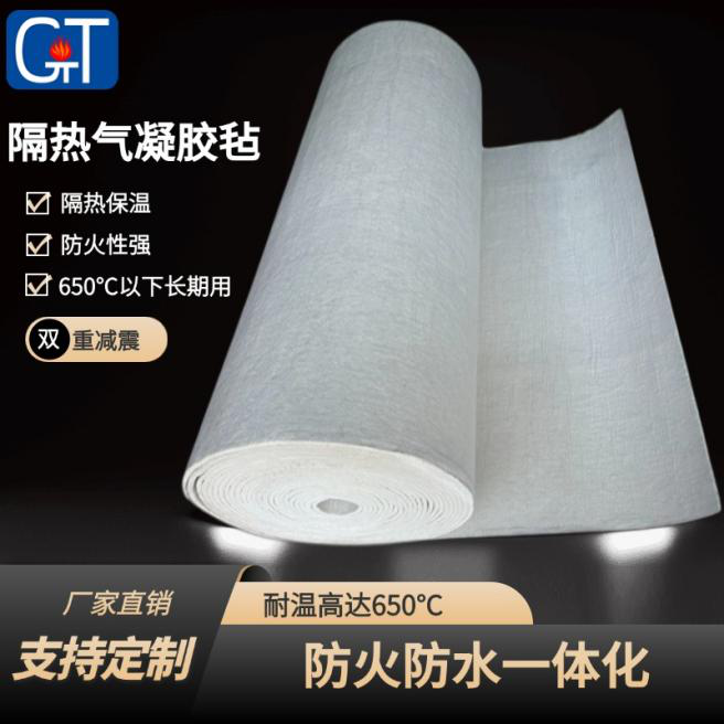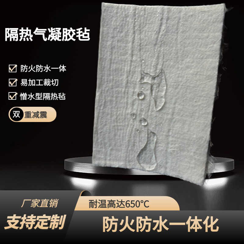 气凝胶毡产品是利用专有技术,将纳米多孔气凝胶与无机纤维材料复合而成的一种柔软、疏水、高温稳定、防火阻燃、不掉分绝热保温毡。特殊的工艺使得气凝胶毡具有导热系数低、密度小、整体疏水性能极好、防火阻燃等级可达到A1级,属于不燃材料,运输和使用过程中无粉末脱落、绿色环保,同时还具有优越的隔音降噪、防压减振的特性。